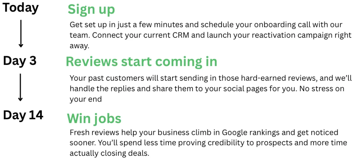 During your two week free trial we will launch our review reactivation bringing in a bunch of reviews before you pay a dime.